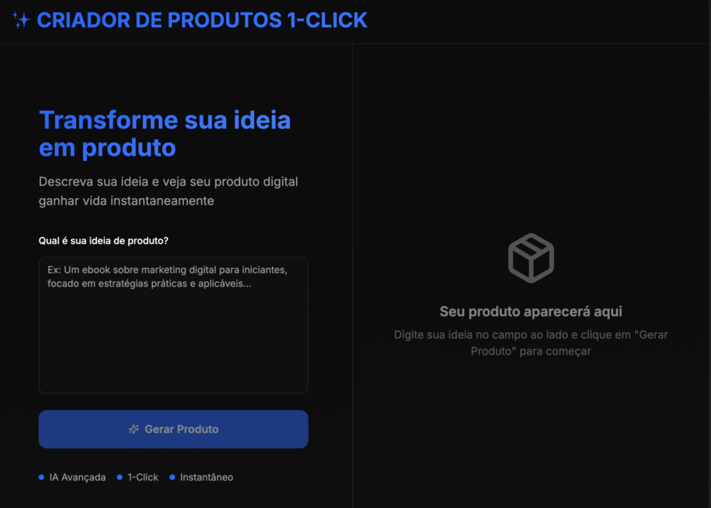 Imagina, ter um local onde você fala sobre a sua ideias de produto e a IA gera ele completo para você? Com o criador de produtos da Million, você só precisa ter a ideia, o resto ele faz!