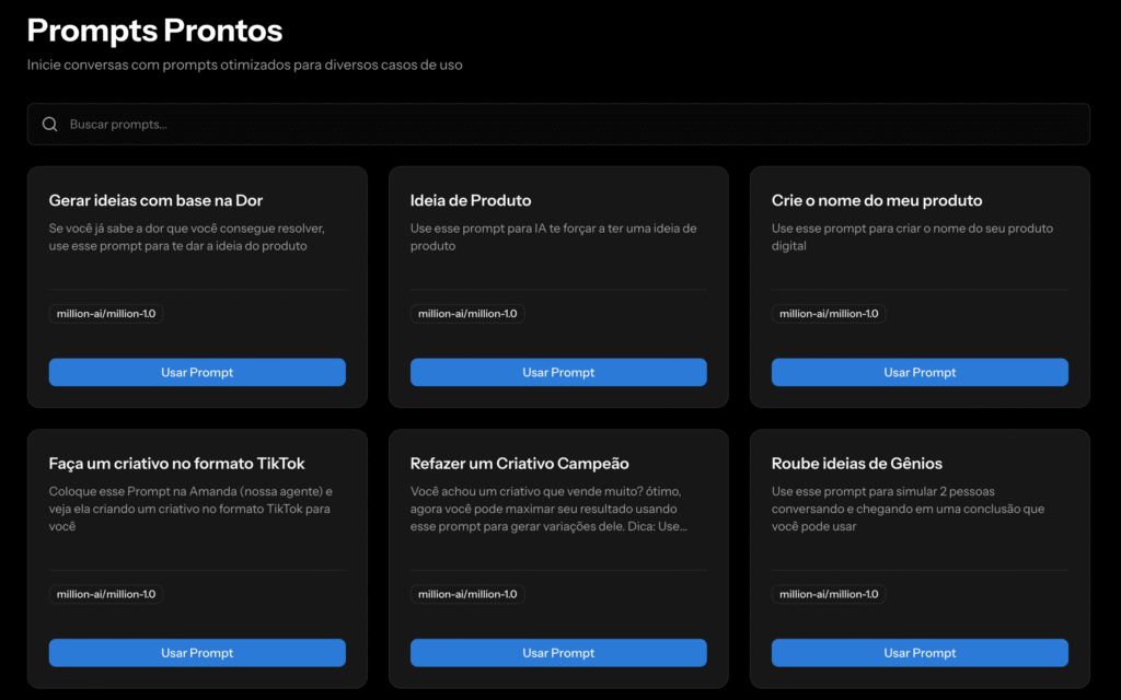 A Million IA é um sistema com agentes de IA que criam produtos digitais completos pra você, do zero, em minutos.